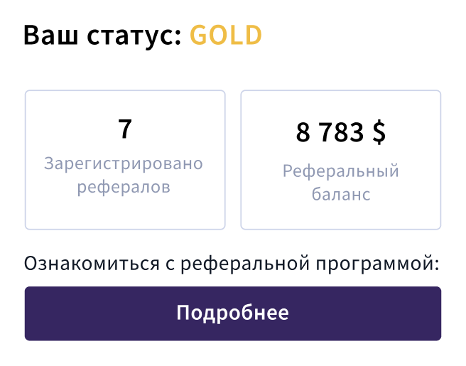 GoldПроценты от активности ваших рефералов и привлеченных ими клиентов | Статус автоматически обновится, когда количество рефералов 1-го уровня достигнет 5. | 5-9 | Вы получаете доход за первый и второй уровни рефералов | 25% от комиссии ваших рефералов + 10% от 2-го уровня | 5 лет |